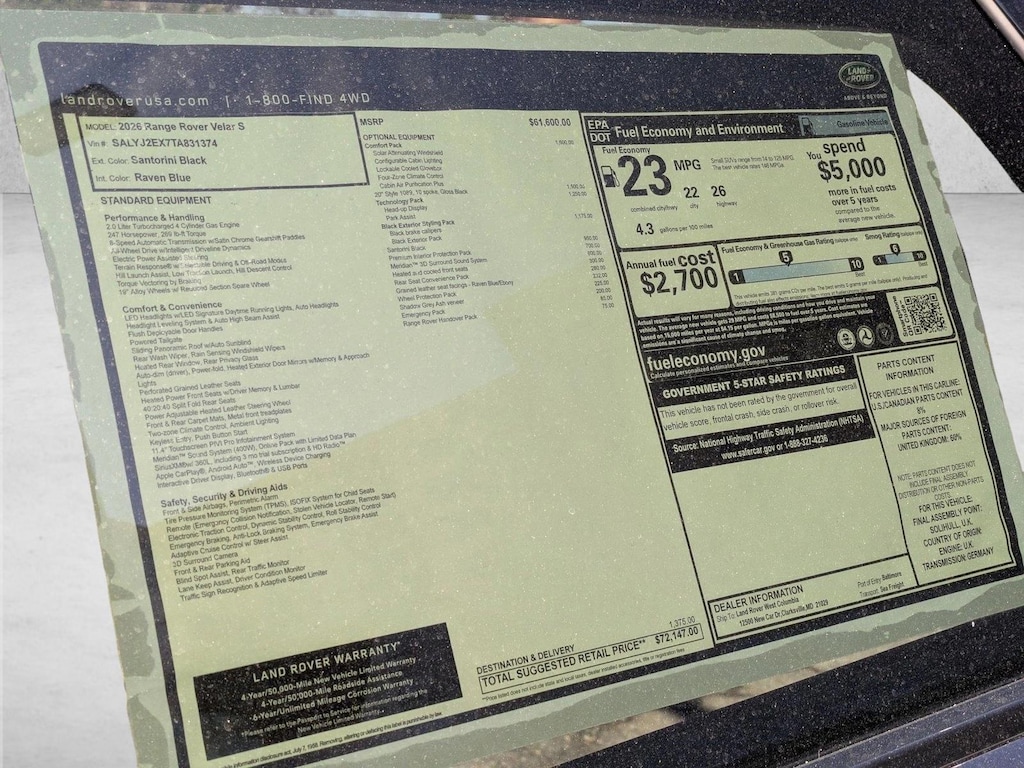 New 2026 Range Rover Velar P250 S Premium Unleaded